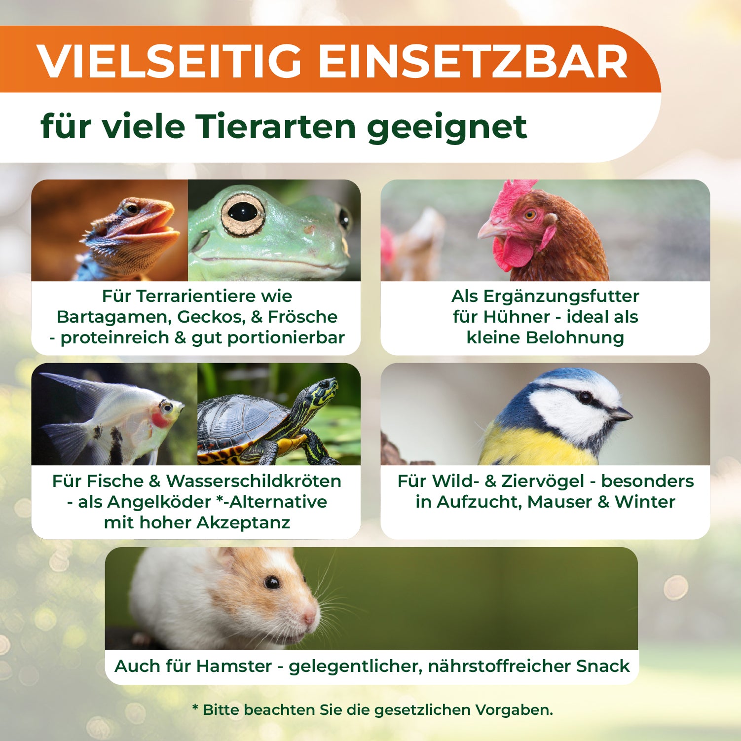 Wildvögel: Nur für Arten geeignet, die Insekten fressen. Bei geschwächten oder kranken Tieren vorab Rücksprache mit Fachstelle oder Tierarzt halten.