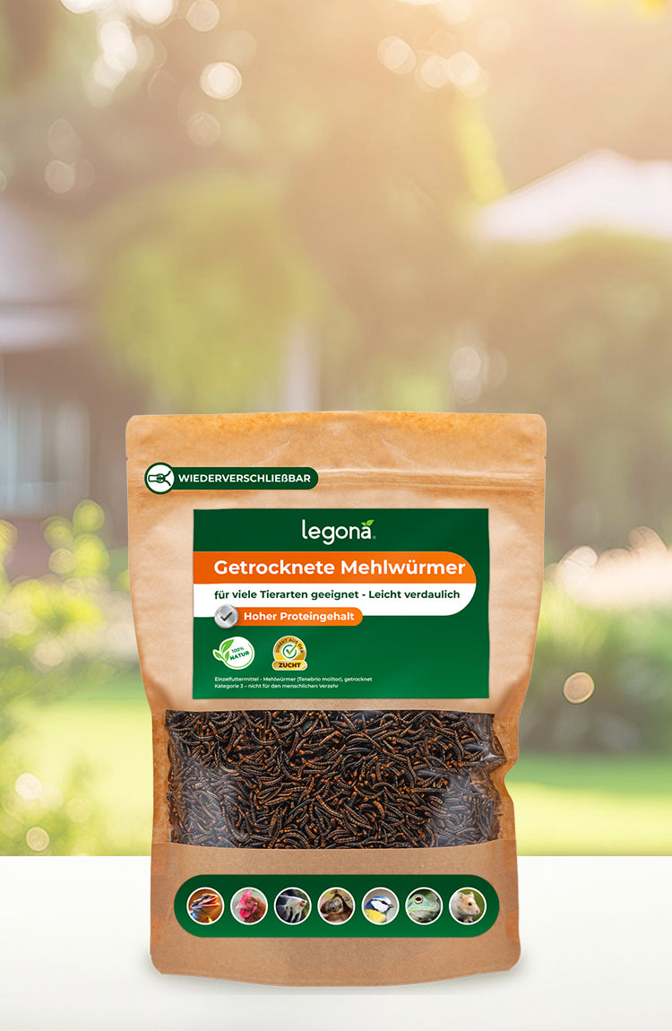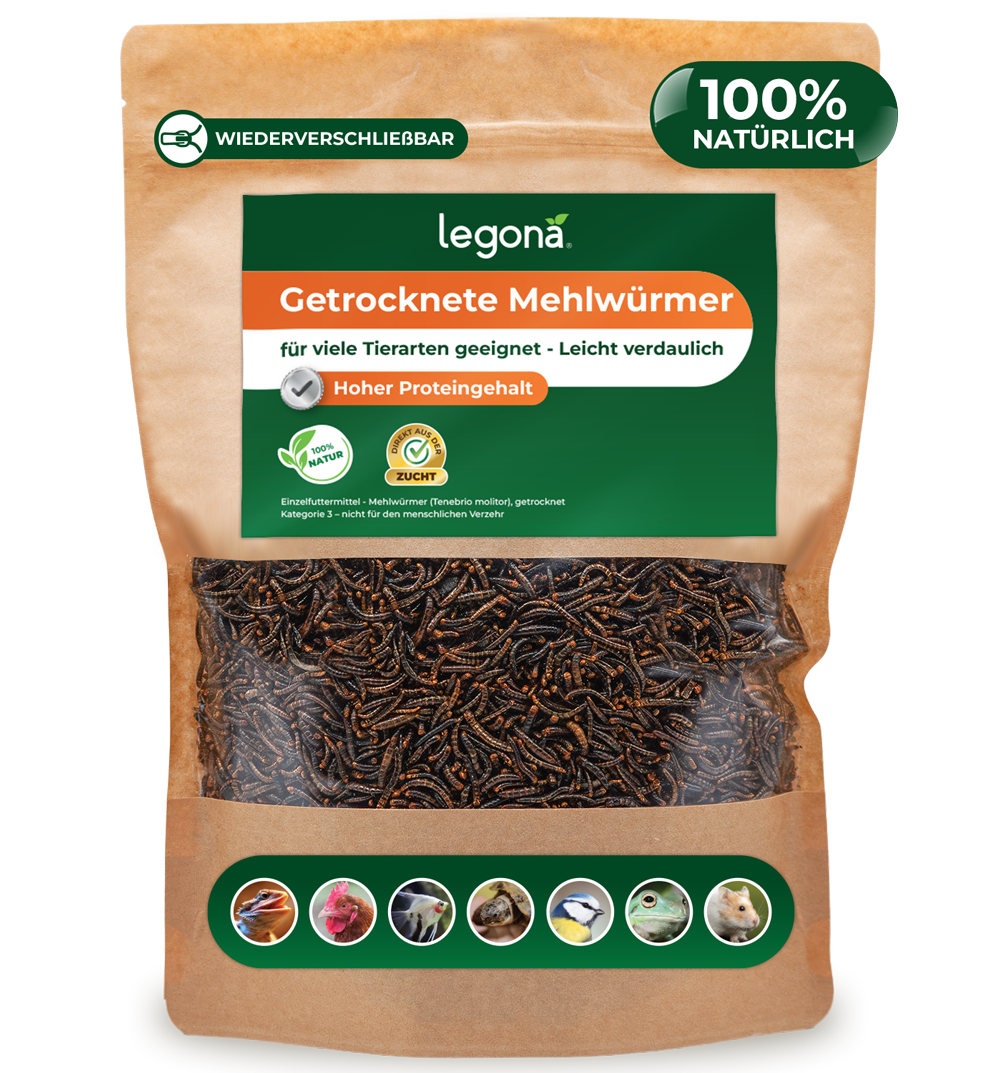 Als natürliches, eiweißreiches Einzelfuttermittel eignen sich getrocknete Mehlwürmer ideal zur Ergänzung für zahlreiche insektenfressende Tierarten. Ob Reptilien wie Bartagamen und Geckos, Amphibien wie Frösche, Hühner, Vögel oder ausgewählte Fischarten, Wasserschildkröten und sogar Hamster. Sie sind leicht zu dosieren und vielseitig verwendbar: ob als Snack aus der Hand, zur gezielten Unterstützung in anspruchsvollen Phasen oder einfach als naturnahe Futterergänzung. Die Gabe sollte regelmäßig, aber in angepasster Menge erfolgen - getrocknete Mehlwürmer sind eine sinnvolle Ergänzung, jedoch kein Alleinfutter.